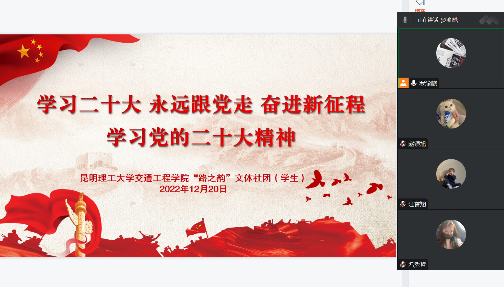 “路之韵”文体社团(学生)团支部以线上的方式开展“学习二十大 永远跟党走 奋进新征程”主题团日活动,社团指导老师赵云瑶、社团团支部全体成员参加本次团日活动。