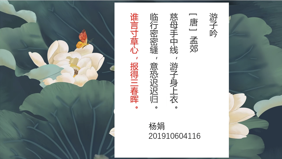 本次PPT设计大赛由参与活动的同学在活动期间将自己原创的以“谁言寸草心,报得三春晖”为主题的PPT上传到社团工作人员邮箱,社团工作人员以作品的主题契合度、播放效果、整体协调程度、创新创意等多方面综合考量进行评选,最终评选出优秀作品3件,此次活动进行得十分顺利,并取得圆满成功。