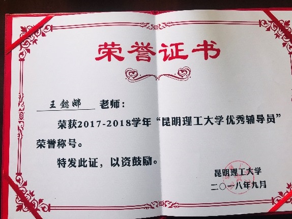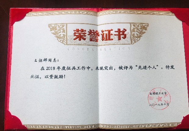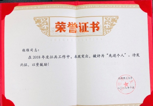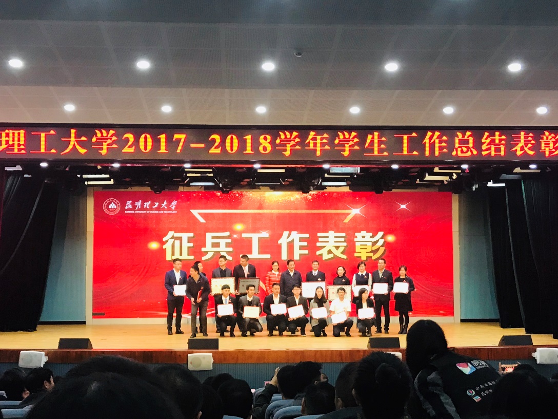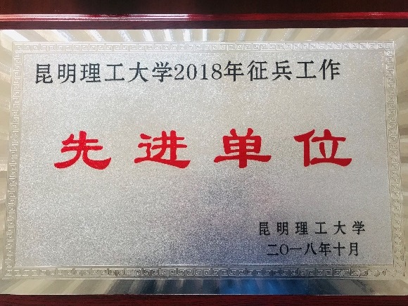 荣获昆明理工大学2018年兵工作“先进单位”表彰,党委副书记张强同志荣获征兵工作“先进个人”称号,学工办主任王懿娜同志荣获校级“优秀辅导员”称号、征兵工作“先进个人”称号。