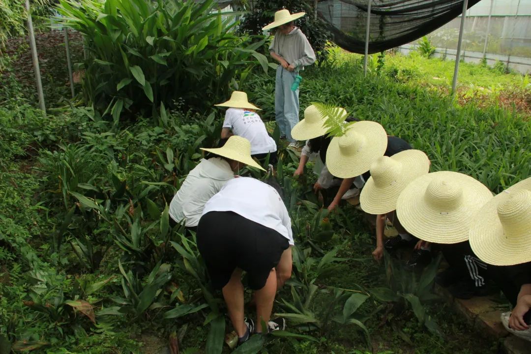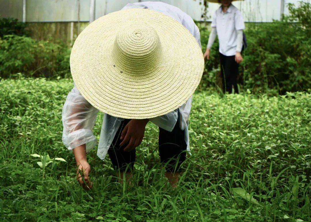 基地管理员向实践队介绍了基地内主要培育的中药材类别、功效等情况,并带领实践队对草药的种植培育工作进行观摩。随后,在管理员的带领下,实践队以小组为单位,在基地内积极劳动——拔除杂草。