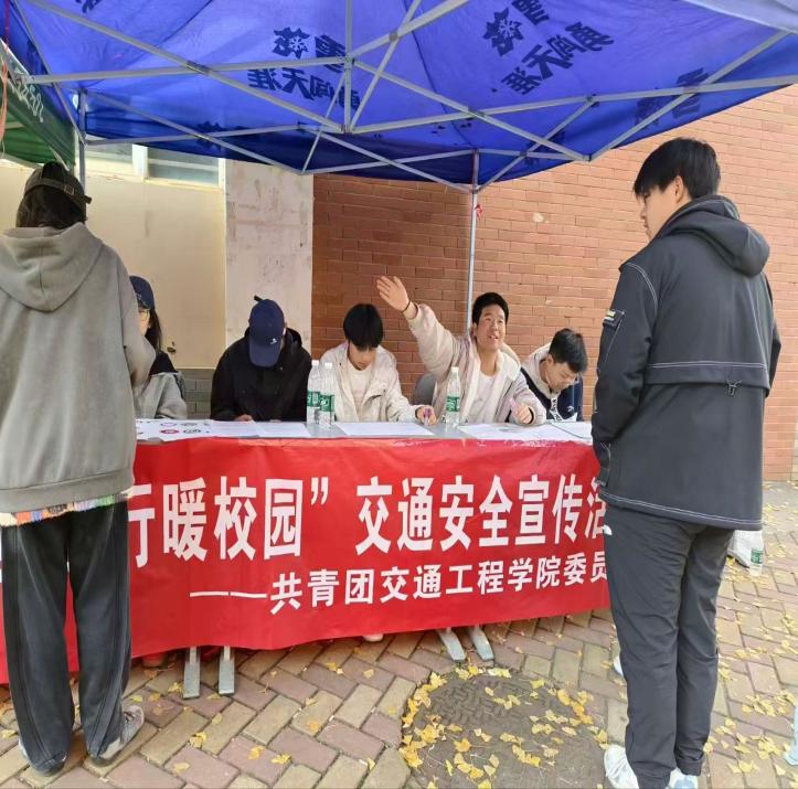 活动的最后组织了全体工作人员合影,银杏叶铺满活动场地,红幅衬着暖阳,大家满心是为同学们科普知识的喜悦,脸上都洋溢着笑容。这场活动让安全意识漫入校园烟火,以沉浸式互动传递交通安全知识,既响应了国家号召、践行了专业使命,也填补了同学们的认知空白,为构建平安校园凝聚了青春力量。
