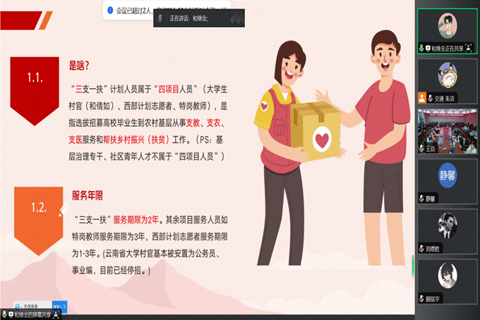 分享会上,和继全首先结合自身在昆明市宜良县耿家营乡文化综合服务中心的工作经验向同学们讲述了“三支一扶”“西部计划”等基层就业项目的政策背景和现实意义,分享了基层工作所面临的挑战和困惑,以及如何加入基层就业队伍。服务于广西壮族自治区那坡县百省乡人民政府的刘德胜为大家分享了各地不同政策待遇等相关问题,并鼓励同学们积极响应国家政策,坚定信念,努力进取,找到真正属于自己的人生之路。